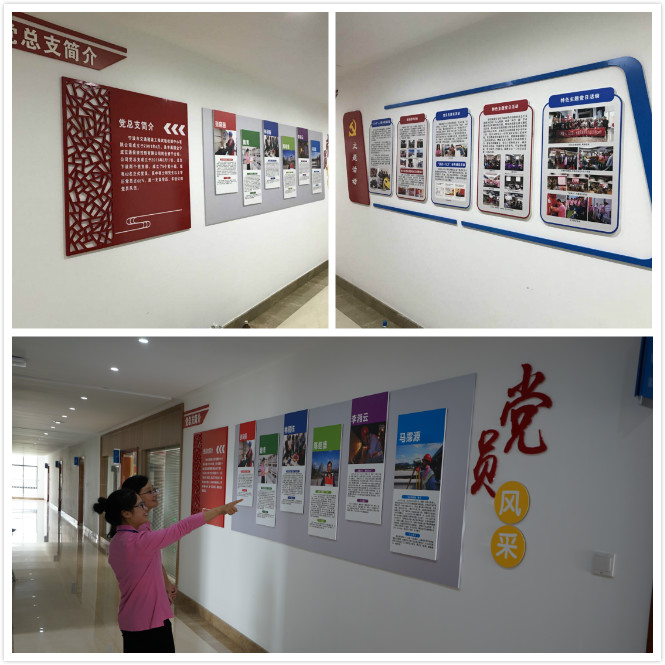 將走廊的“空白墻”設計成企業(yè)黨建文化長廊。整個長廊以“建陣地、強組織、展分采、聚人心”為主線,以鮮艷的紅色為主色調,以黨和國家標志性圖案為背景,以圖文并茂、喜聞樂見的表現(xiàn)形式對十九大精神、兩學一做、黨員風采、主題活動和廉潔宣傳等五方面內容進行了上墻,其中“黨員風采”上的六名年度優(yōu)秀黨員的先進事跡,成為了大家駐足觀看的焦點,較好的促成了內部形成“人人爭當先進,處處彰顯黨性”的良好氛圍。