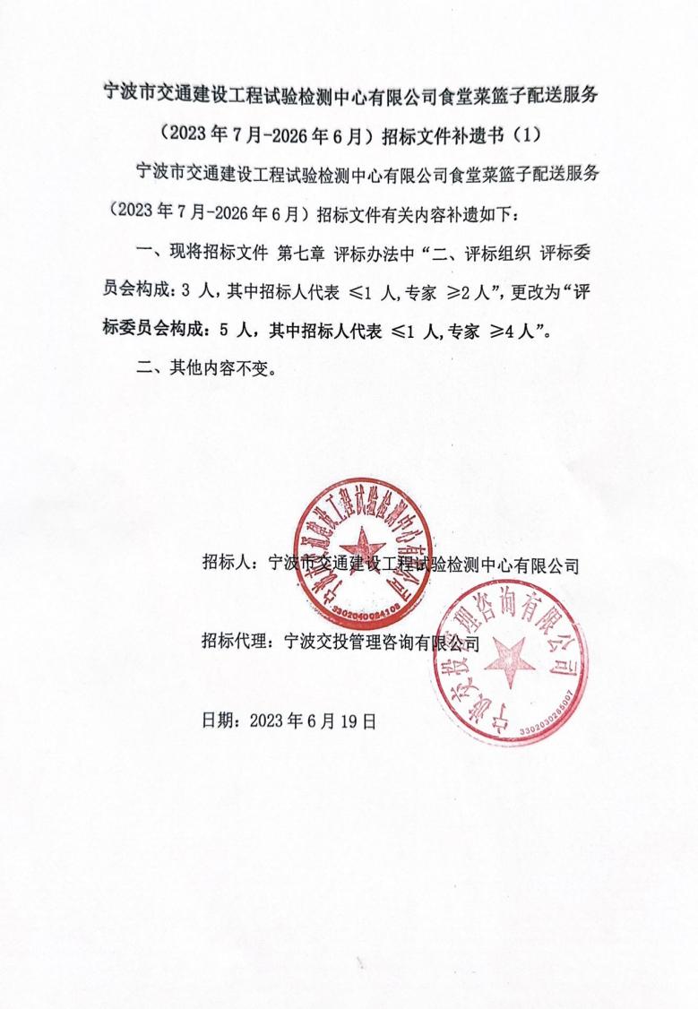 寧波市交通建設(shè)工程試驗(yàn)檢測中心有限公司食堂菜籃子配送服務(wù)(2023年7月-2026年6月)招標(biāo)文件補(bǔ)遺書(1)