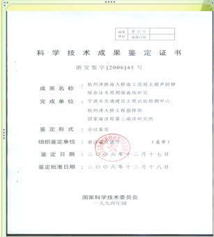 課題:杭州灣跨海大橋海工混凝土超聲回彈綜合法專用測(cè)強(qiáng)曲線研究鑒定證書(shū)