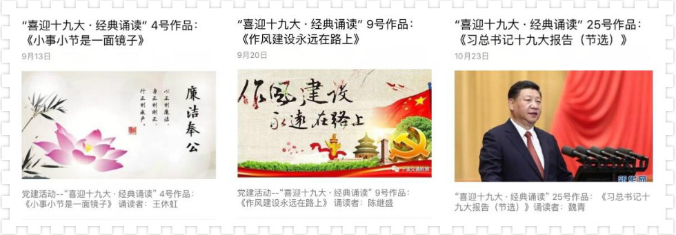 公司黨總支自9月中旬開始,在公司自主開發(fā)的微信公眾號推送“喜迎十九大·經(jīng)典誦讀”活動。每日推送一名黨員同志朗誦的習近平系列講話等經(jīng)典作品,并在公司“紅色根據(jù)地”黨員微信群和QQ群中組織黨員對所誦讀內(nèi)容進行討論?;顒訕O大地激發(fā)了黨員干部們學理論、用理論的熱情。大會召開期間,十九大報告原文更是成了黨員們首選的誦讀作品。